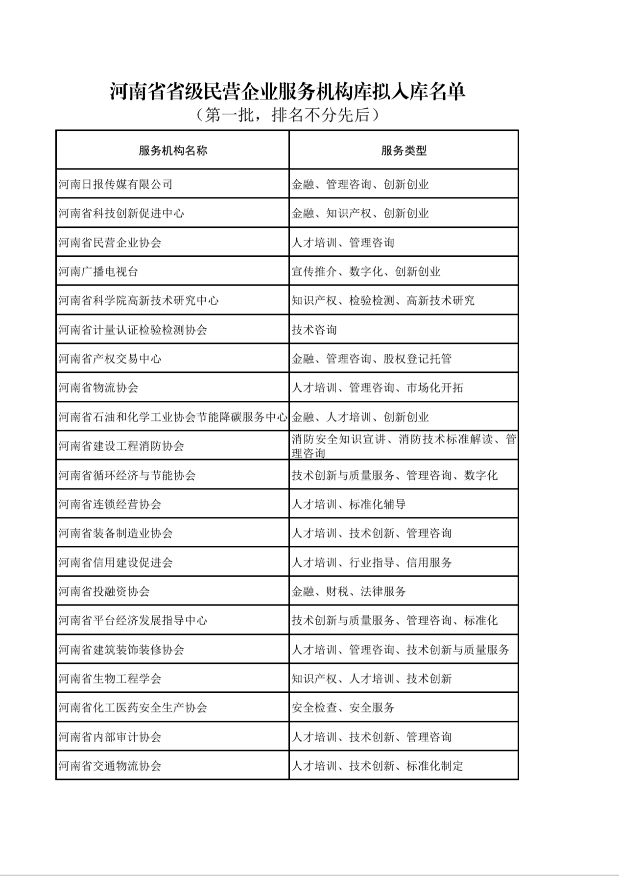 根据《河南省发展和改革委员会关于建立省级民营企业服务机构库的通知》有关要求,经机构自愿申报、各地审核推荐、专家评审等程序,初步确定了河南省省级民营企业服务机构库拟入库名单(第一批),现予以公示。公示期为2025年11月18日至11月21日。如有异议,请于公示期内反映,并附相应证明材料。相关材料请注明联系方式并加盖公章,以PDF电子版发送至电子邮箱,逾期提交、未提供证明材料的不予受理。